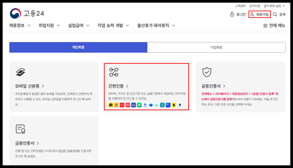 고용24를 처음 사용하시는 분들이라면, 회원가입 눌러서 가입 후 실명인증까지 해주셔야 합니다.