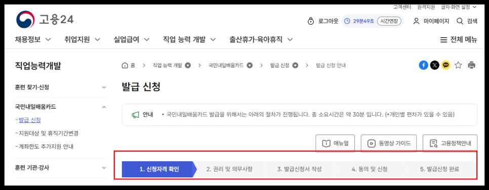 직업 능력 개발창에서 👉 국민내일배움카드 👉 발급 신청 클릭해주세요.